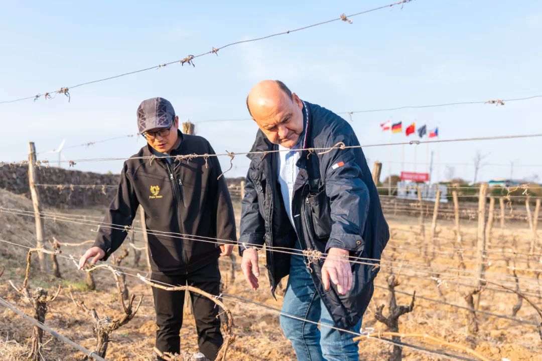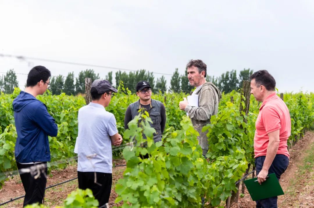種植顧問Eric與九頂莊園種植團(tuán)隊考察葡萄園,指導(dǎo)日常工作,討論指導(dǎo)病害防治、葉幕管理、產(chǎn)量控制(個別品種疏穗)、雜草控制、新建園種植等。