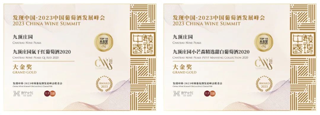 九頂莊園葡萄酒榮獲2023上海發(fā)展峰會2枚大金獎。