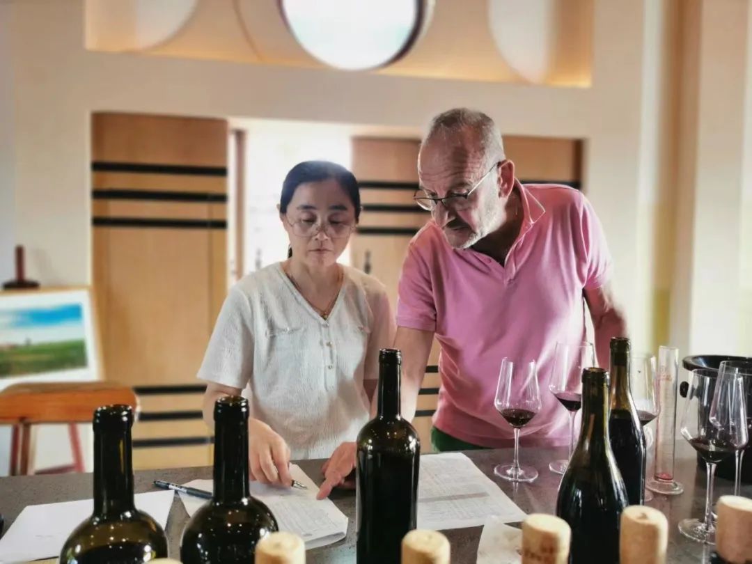 九頂莊園釀酒顧問馬克和釀酒師金海霞進(jìn)行2022年干白調(diào)配工作。