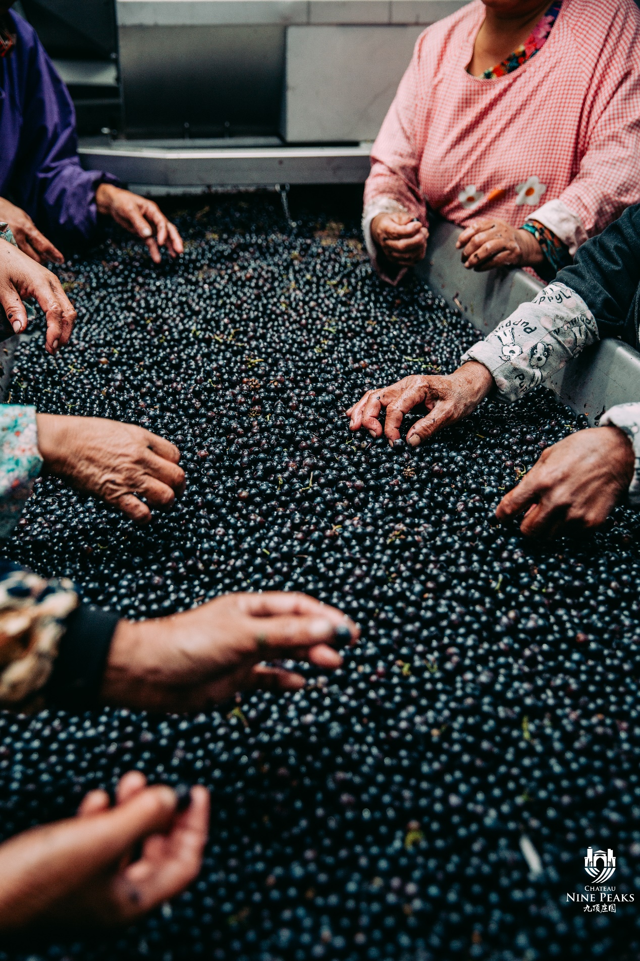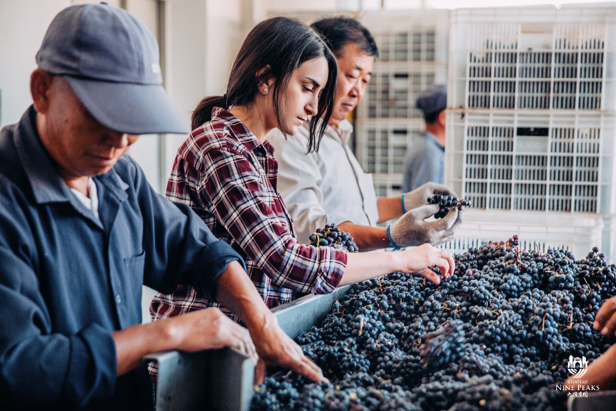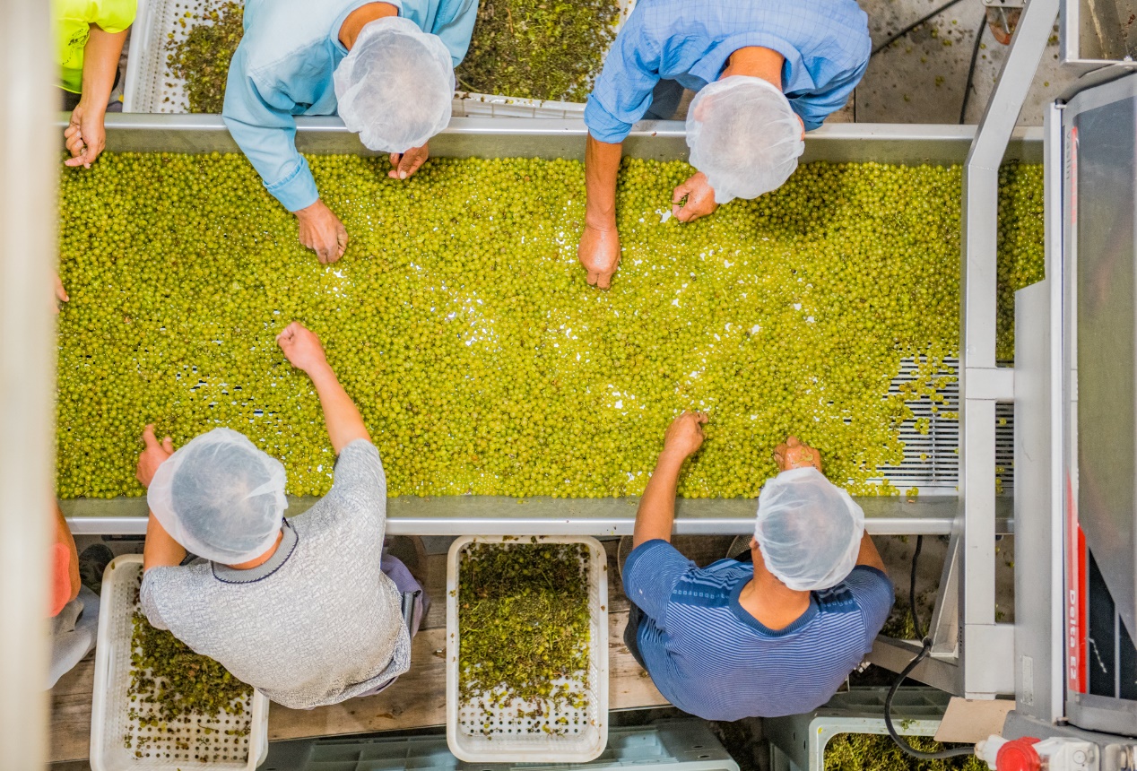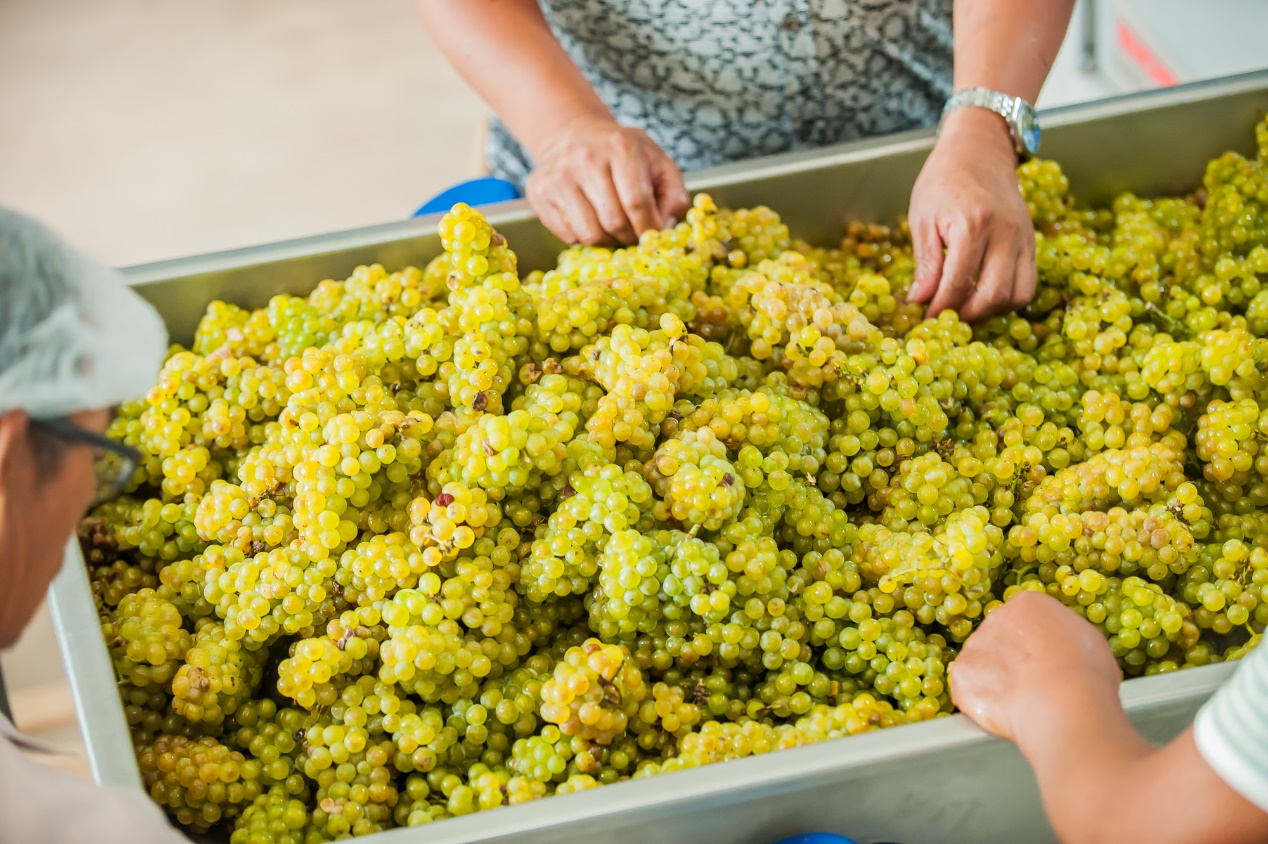 葡萄采收后,運送到發(fā)酵車間,進行兩次人工篩選。首先進行穗選,去除葡萄穗的葉子,蟲子,小石頭。