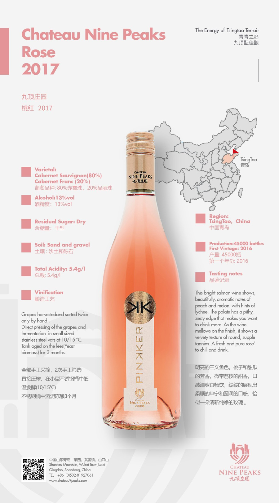 九頂莊園2017Pinkker 桃紅,80%赤霞珠,20%品麗珠,明亮的三文魚色,桃子和甜瓜的芳香,微帶荔枝的甜香。