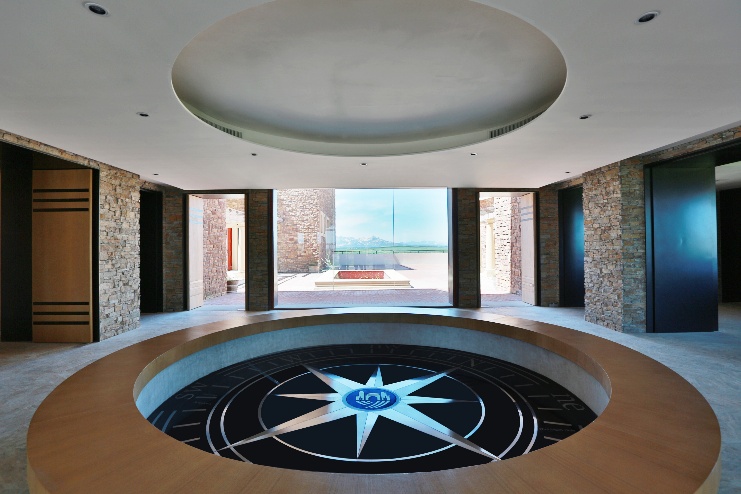 從酒莊極具特色的石拱門進入,映入眼簾的是有著無窮精致的接待大廳。大廳中央的大理石盤上標識著世界上著名葡萄酒產區(qū)的方位及名字。大廳的一側為葡萄酒精品店,陳列著九頂莊園的產品其姐妹酒莊出產的獲獎酒品。除此以外,客人還可以在這里為自己或親朋好友買到酒莊紀念品,見證一次獨特的酒莊之旅。